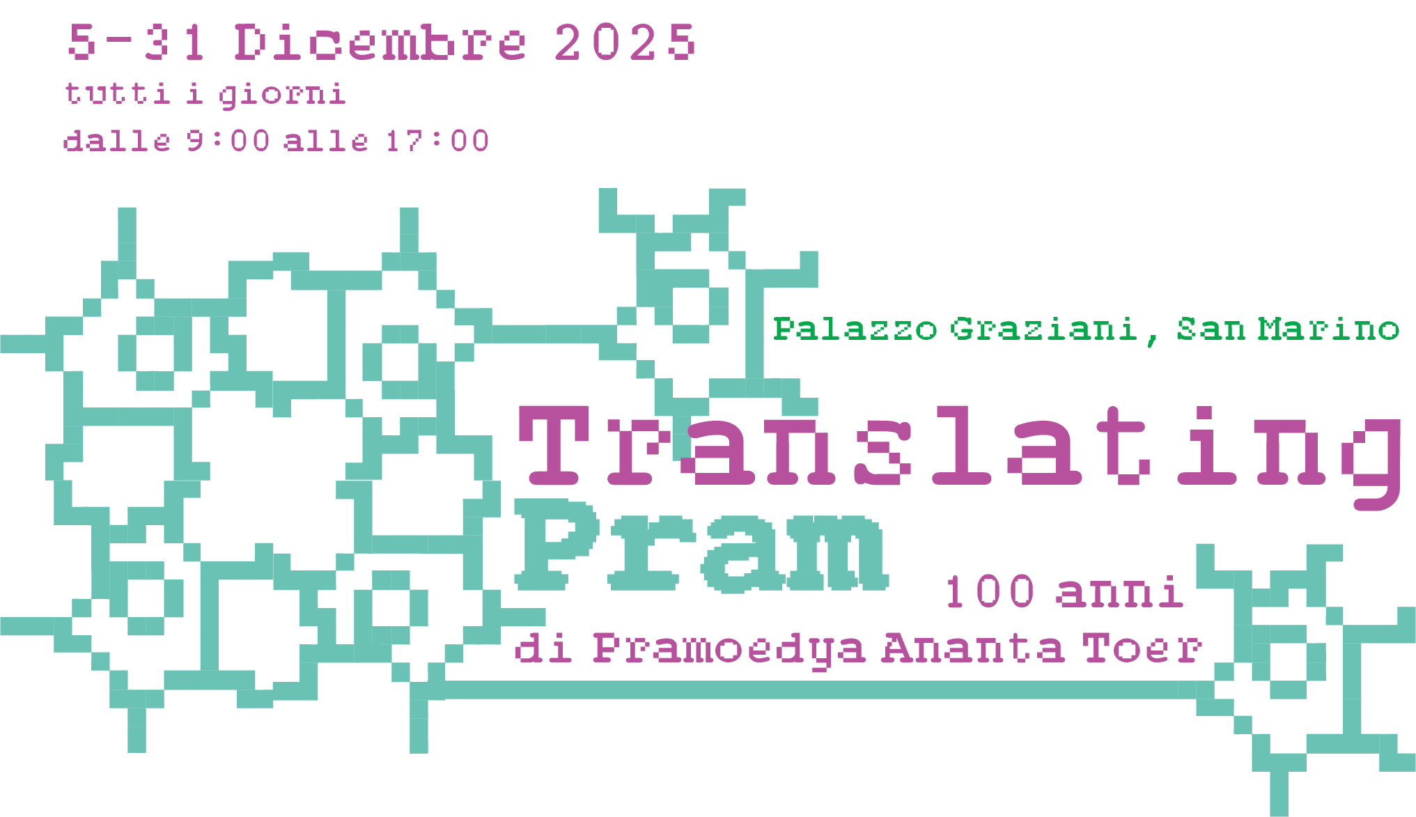 Translating Pram è un progetto curatoriale interdisciplinare, ideato dai curatori Chiara Giardi, Paola Pietronave, Berto Tukan e Moch Hasrul, in collaborazione con la Kalbis University (Indonesia), l’Università degli Studi della Repubblica di San Marino (UNIRSM) e 3 ARROWS S.c.a.r.l. Il progetto nasce per commemorare il centenario della nascita di Pramoedya Ananta Toer (1925–2006), attraverso una serie di mostre, incontri e workshop che esplorano la sua eredità intellettuale e promuovono una storiografia basata sulla cittadinanza. Con un approccio partecipativo e interculturale, Translating Pram collega le narrazioni storiche indonesiane ai contesti globali, invitando il pubblico a diventare co-autore della storia.